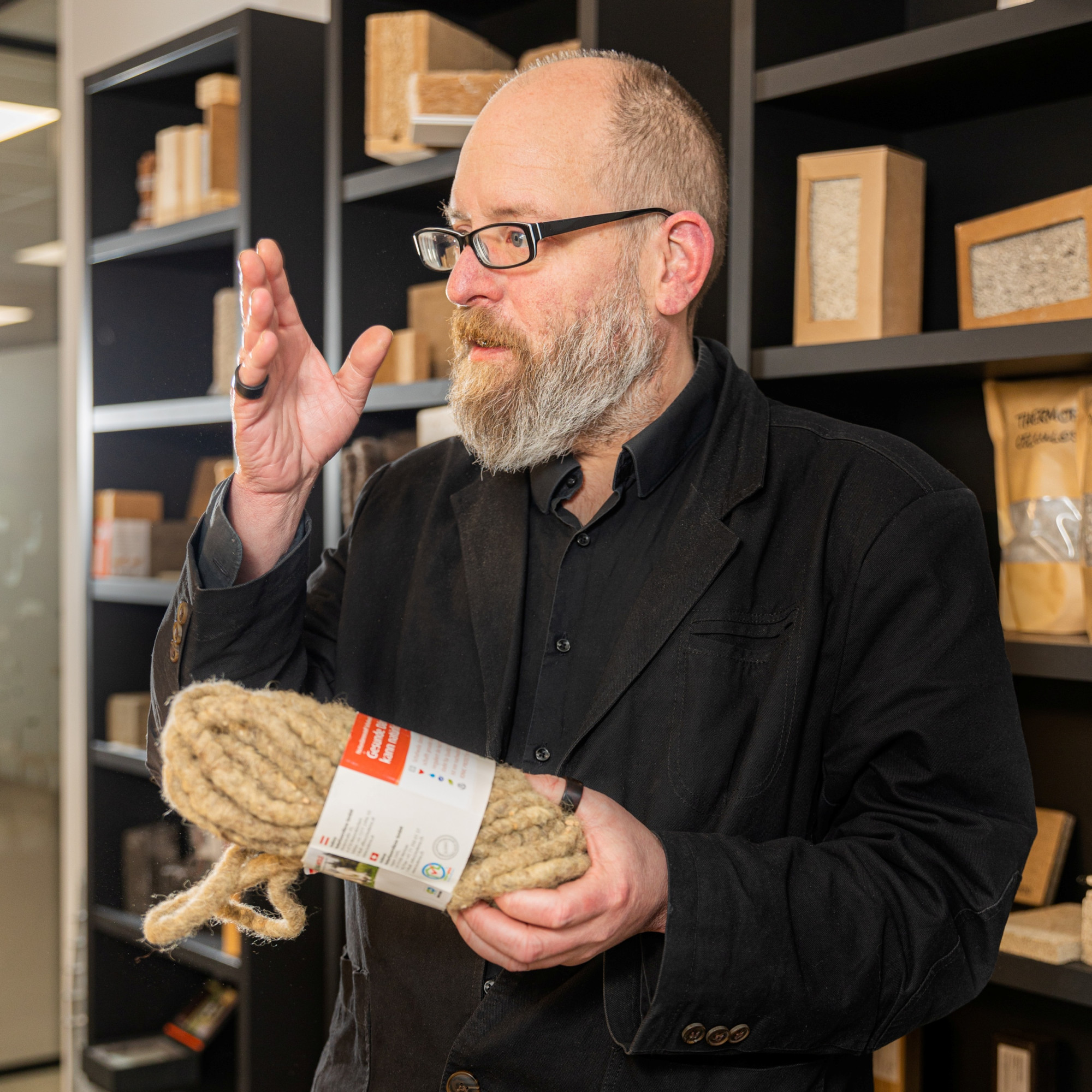 ‘Kijk, dit is een biocomposiet gekleurd met blauwalg, deze schapenwol is een goed alternatief voor purschuim als kierdichting en waarom zou je niet kiezen voor houten nagels?’ Max Drath tovert het ene na het andere biobased materiaal tevoorschijn uit de wandkast op het kantoor van Aveco de Bondt of ecologische bouwmaterialen, zoals hij het liever noemt. In hoeverre is het onderwijs ingericht op deze nieuwe ontwikkelingen? Wat weten en leren studenten over houtbouw en ecologische materialen? De architect en bouwbioloog schetst hoe onderwijs, bedrijfsleven en overheid biobased bouwen samen verder brengen.