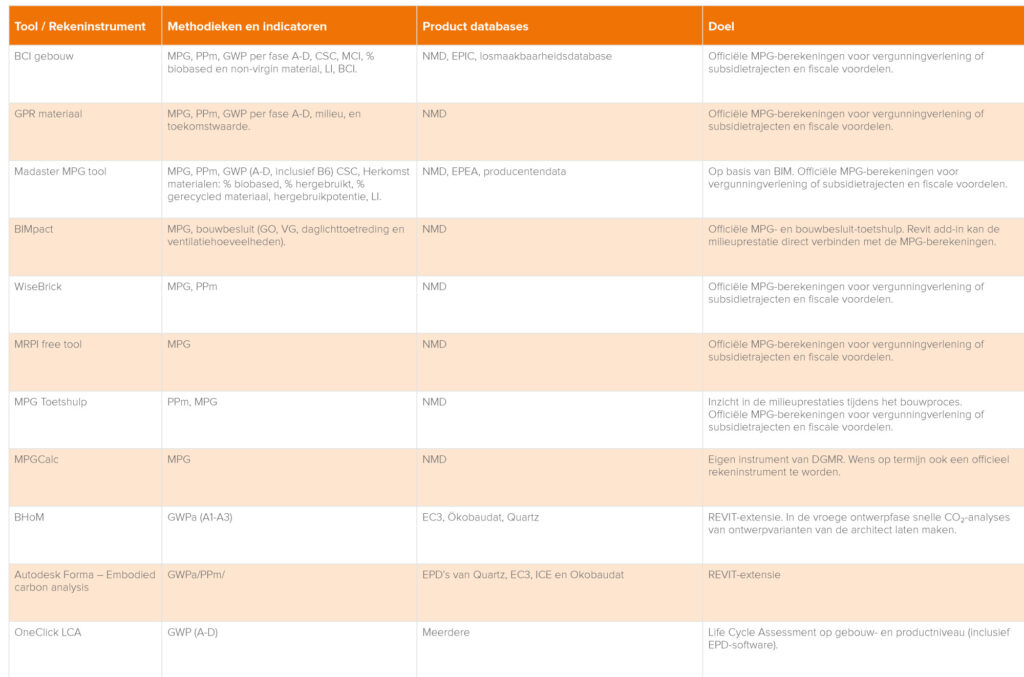 Er zijn verschillende tools beschikbaar voor het inzichtelijk maken van de CO2-emissies die vrijkomen tijdens het ontwerp- en bouwproces. Deze tools richten zich op diverse indicatoren en zijn gekoppeld aan verschillende databases met LCA-gegevens (Life Cycle Assessment). In tabel 2 staan de verschillende tools die momenteel op de markt zijn of nog in ontwikkeling zijn, evenals hun specifieke toepassingen. Op Europees niveau is er een overzicht van instrumenten te vinden op de website van Level(s).