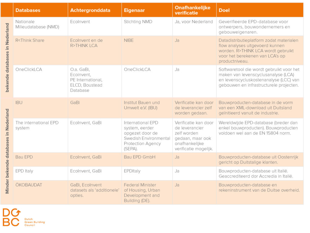 Tabel 3 benoemt enkele van de EPD-databases die worden gebruikt in de tools beschreven in tabel 2, en welke LCI-database zij gebruiken. Ook staan er EPD-databases in de lijst die internationaal of Europees zijn. Er zijn nog veel andere landelijke databases en we verwachten dat er de komende jaren nog meer bij zullen komen als gevolg van Europese wet- en regelgeving.