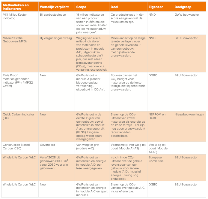 Methodieken en indicatoren zijn in het leven geroepen om CO2– of duurzaamheidsprestaties van materialen, producten en gebouwen inzichtelijk te maken. Het zijn vastgelegde afspraken. Tabel 1 geeft een overzicht van de methodieken en indicatoren die in Nederland worden toegepast. Alleen de MPG is momenteel wettelijk verplicht. De andere indicatoren geven voornamelijk inzicht in de CO2-uitstoot in bepaalde fasen van een levensduur van een gebouw of de opslag van CO2 in biobased constructies.