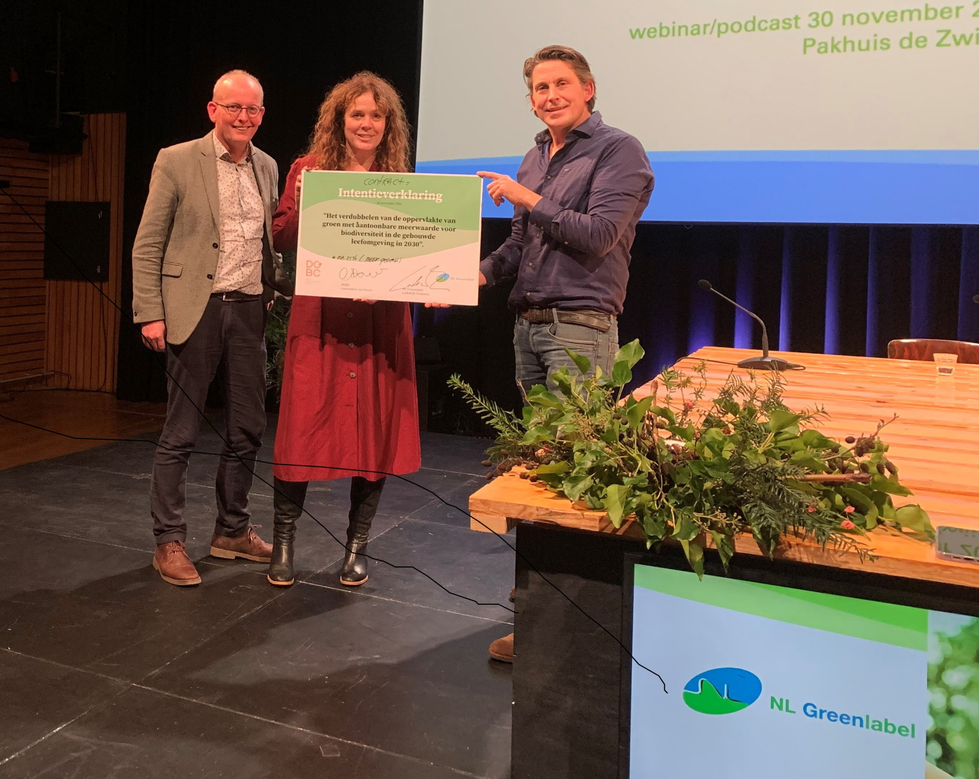 Twee keer zo veel groene, biodiverse vierkante meters in de gebouwde omgeving in 2030. Dat is de basis voor een doelgerichte samenwerking van de organisaties NL Greenlabel en Dutch Green Building Council (DGBC). Lodewijk Hoekstra (NL Greenlabel) en Annemarie van Doorn (DGBC) bezegelden die nieuwe samenwerking door op dinsdag 30 november een intentieverklaring te ondertekenen.
