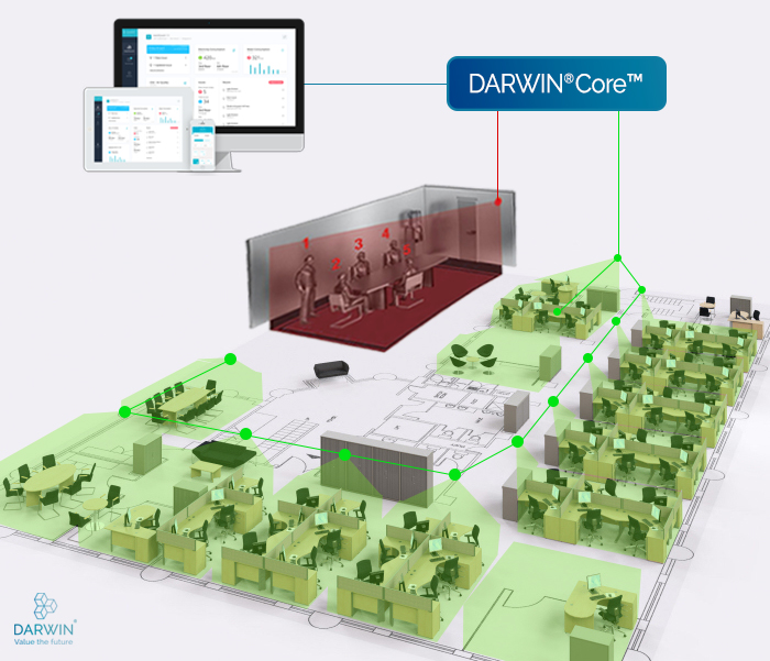 DARWIN® SPACES? werd in eerste instantie ontwikkeld om op een slimme manier ruimtecondities als temperatuur, CO2, luchtvochtigheid, VOS (pollen) en aanwezigheid te meten, te analyseren en te visualiseren. In samenwerking met partner STEINEL® werd daar nu een slimme toepassing aan toegevoegd, namelijk het in kaart brengen van de social distancing binnen ruimtes. Op deze manier geeft DARWIN® invulling aan de ambitie om actief bij te dragen aan veilige en gezonde werk en leefomgevingen in de naderende anderhalve meter economie.