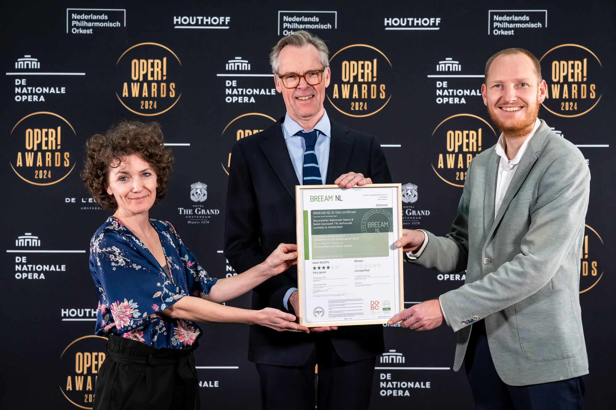 BREEAM-NL wordt ontwikkeld en beheerd door Dutch Green Building Council (DGBC), de landelijke maatschappelijke organisatie die zich inzet om de gebouwde omgeving in hoog tempo toekomstbestendig te maken. Het nieuwe certificaat voor Nationale Opera & Ballet werd uitgereikt door Rudy van der Helm, manager Ontwikkeling en Beheer bij DGBC. Algemeen directeur van Nationale Opera & Ballet Stijn Schoonderwoerd nam het certificaat in ontvangst: