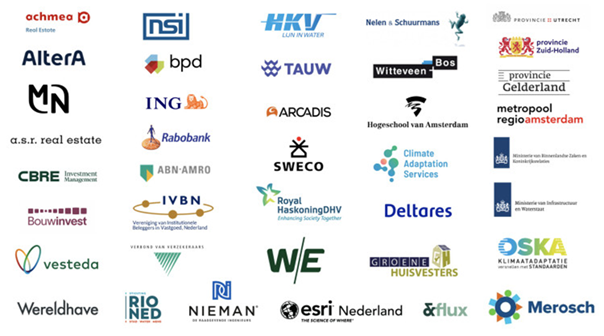 Het Framework for Climate Adaptive Buildings is mede mogelijk gemaakt door ruim 40 partijen, waaronder vastgoedbeleggers, financiële instellingen, kennisinstituten, adviseurs en overheden. Dit zijn: Ministerie van Binnenlandse Zaken en Koninkrijksrelaties, Ministerie van Infrastructuur en Waterstaat, Rijksdienst voor Ondernemend Nederland, Provincie Gelderland, Provincie Utrecht, Provincie Zuid-Holland, Metropoolregio Amsterdam, ING, Rabobank, ABN AMRO, Verbond van Verzekeraars, W/E, Bouwinvest, MN, a.s.r. real estate, CBRE IM, Vesteda, IVBN, Altera, NSI, Achmea Real Estate, BPD, Esri Nederland, Wereldhave, Sweco, Climate Adaptation Services, Nelen & Schuurmans, TAUW, Arcadis, HKV, Deltares, Nieman, Royal HaskoningDHV, Hogeschool van Amsterdam, Witteveen+Bos, &Flux, stichting RIONED, OSKA, Groene Huisvesters en Merosch.