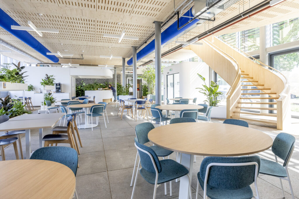 Ook de bestaande delen van het gebouw zijn ingrijpend aangepakt. Materialen werden zorgvuldig geselecteerd met oog voor levensduur en hergebruik. Installaties zijn bewust zichtbaar, waardoor onderhoud en aanpassingen eenvoudiger zijn. Deze ontwerpkeuzes dragen bij aan de circulariteit van het geheel.