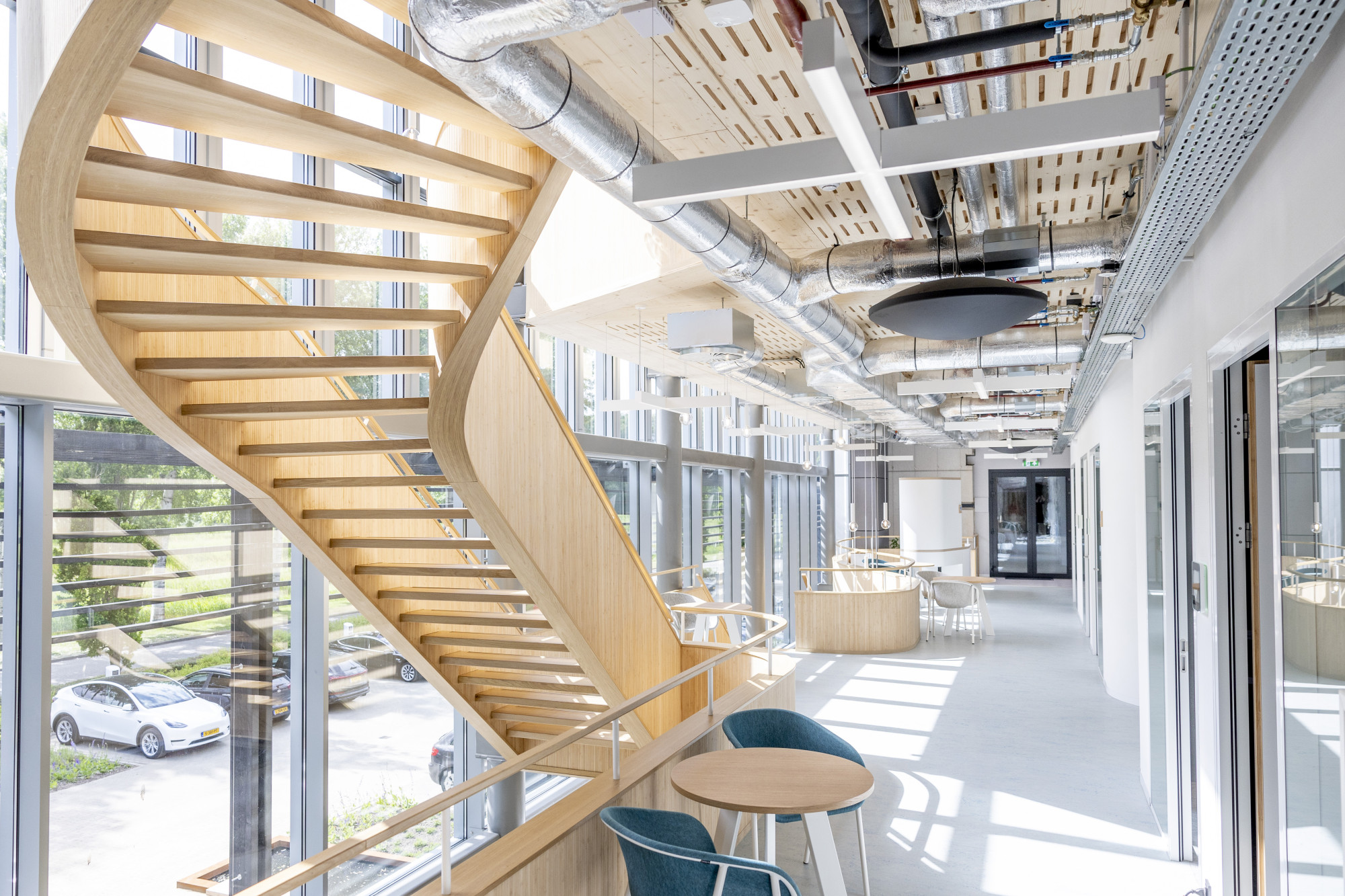 Ook de bestaande delen van het gebouw zijn ingrijpend aangepakt. Materialen werden zorgvuldig geselecteerd met oog voor levensduur en hergebruik. Installaties zijn bewust zichtbaar, waardoor onderhoud en aanpassingen eenvoudiger zijn. Deze ontwerpkeuzes dragen bij aan de circulariteit van het geheel.